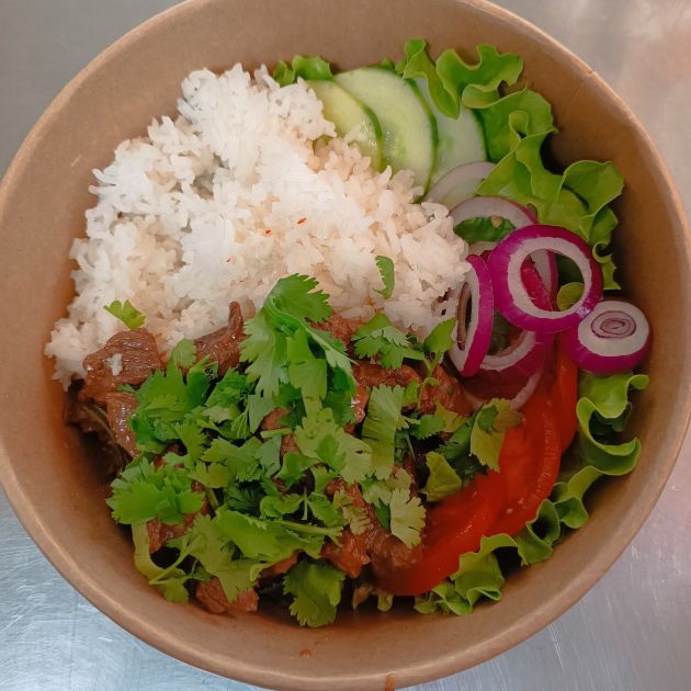 ll s’agit donc de bœuf coupé en morceaux, mariné puis sauté à la plancha et servi sur un lit de salade verte avec des rondelles de tomates et de concombre qui apportent de la fraîcheur. On l’accompagne de riz et d’une sauce au citron vert et au poivre noir dans laquelle on peut tremper la viande avant de la déguster. Un voyage culinaire !